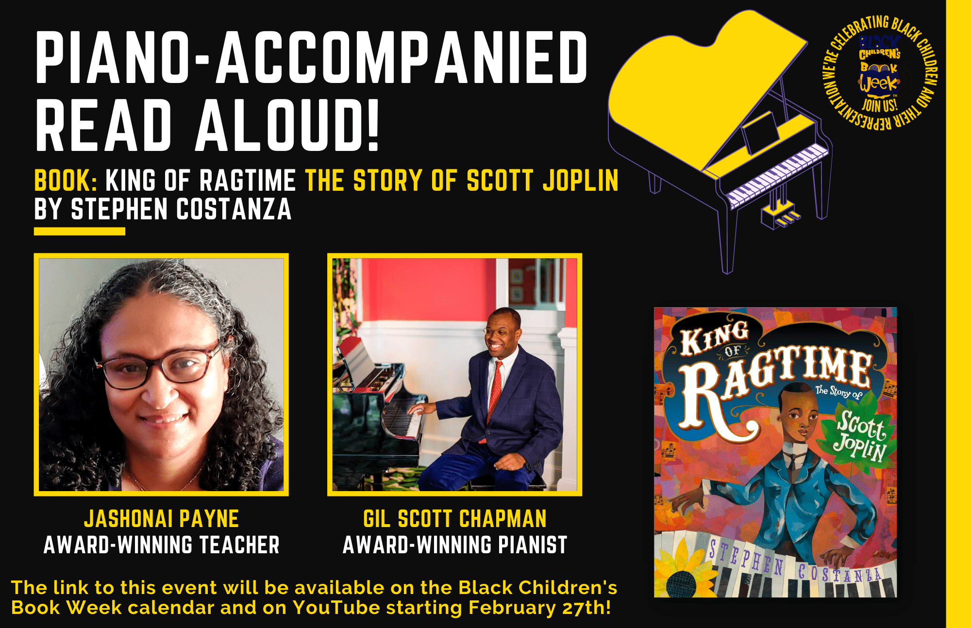 Enjoy this pre-recorded piano-accompanied real aloud of Stephen Costanza’s book, “King of Ragtime The Story of Scott Joplin.” Read by award-winning educator Jashonai Payne, with a performance of some of Scott Joplin’s compositions by award-winning pianist, Gil Scott Chapman!
