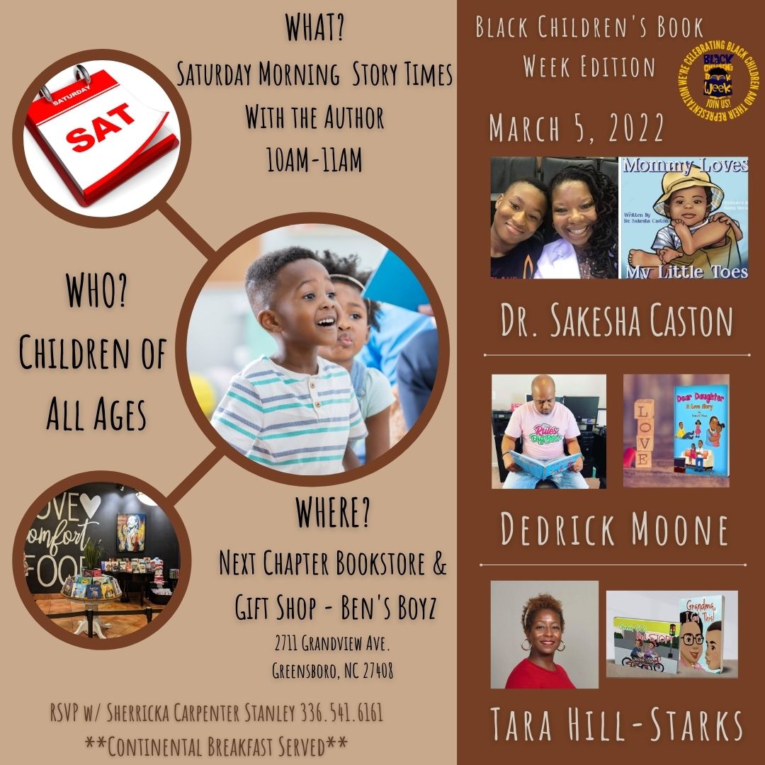 Saturday Morning Story Times With The Author is a monthly event held at Ben’s Boyz Restaurant in Greensboro, NC hosted by Next Chapter Bookstore/Gift Shop – Ben’s Boyz. This hour offers children of all ages to come in and have story times with local authors and engage in Q&A, along with activities related to their books. Book lovers and their families get to purchase signed copies of the books, take pictures with the and interact with these authors.