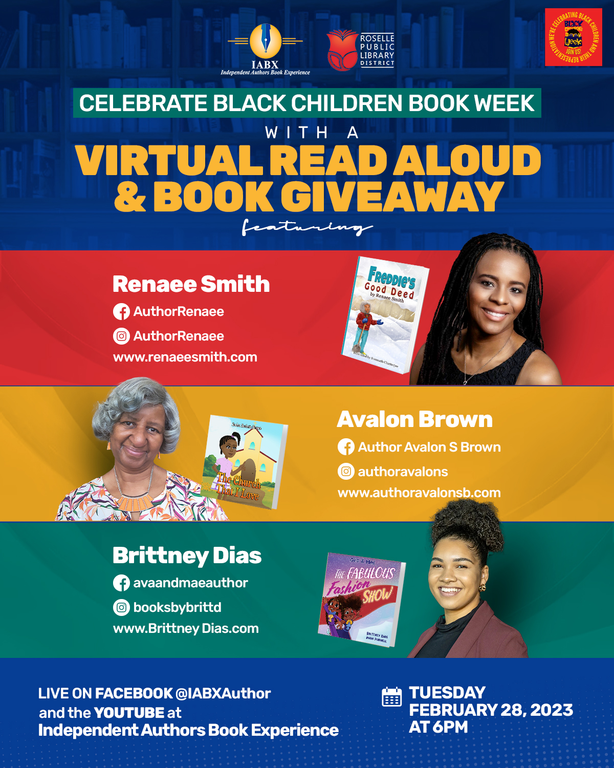 Independent Author Book Experience and the Roselle Public Library celebrates Black Children's Book Week with a Virtual Read Aloud and Giveaway on Tuesday, February 28 from 6pm to 7pm. Live-streaming on Facebook @IABXAuthor and on YouTube at Independent Authors Book Experience