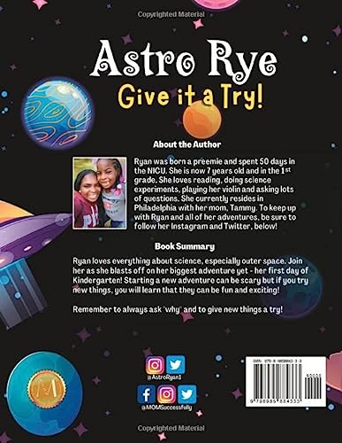 Ryan loves everything about science, especially outer space. Join her as she blasts off on her biggest adventure yet – her first day of Kindergarten! Starting a new adventure can be scary but if you try new things, you will learn that they can be fun and exciting!