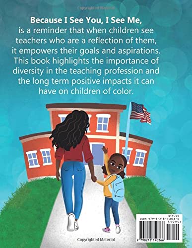 Because I See You, I See Me, is a reminder that when children see teachers who are a reflection of them, it empowers their goals and aspirations. This book highlights the importance of diversity in the teaching profession and the long term positive impacts it can have on children of color.