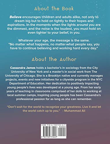 Believe encourages children and adults alike, not only to dream big but to hold on tightly to their hopes and aspirations. In the moments when the lights around you are the dimmest, and the noise is the loudest, you must hold on even tighter to your belief, in you.