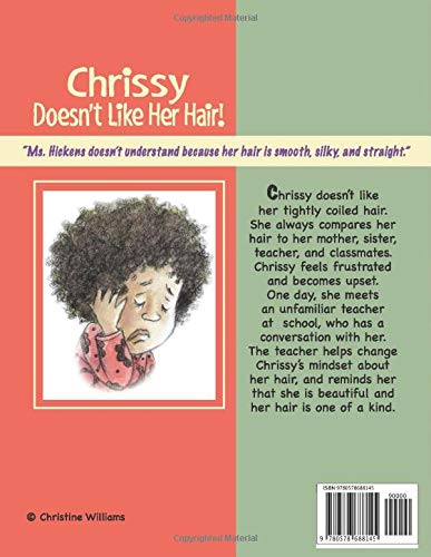 Chrissy doesn’t like her tightly coiled hair. She always compares her hair to her mother, sister, teacher, and classmates. Chrissy feels frustrated and becomes upset. It is not until she meets Ms. Wiggins, who shifts Chrissy’s mindset about her hair, and reminds her that she is beautiful and unique, just the way she was created!