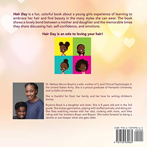 Hair Day is a fun, colorful book about a young girls experience of learning to embrace her hair and find beauty in the many styles she can wear. The book shows a lovely bond between a mother and daughter and the memorable times they share discussing hair, self-confidence, and emotions.Hair Day is an ode to loving your hair!