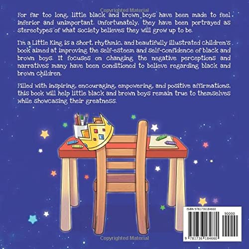 I’m a Little King is a short, rhythmic, and beautifully illustrated children’s book for ages 2-7 aimed at improving the self-esteem and self-confidence of black and brown boys. It focuses on changing the negative perceptions and narratives many have been conditioned to believe regarding black and brown children. Filled with inspiring, encouraging, empowering, and positive affirmations, this book will help little black and brown boys remain true to themselves while showcasing their greatness.