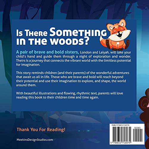 Is There Something in the Woods?A pair of brave and bold sisters, London and Laiyah, will take your child’s hand and guide them through a night of exploration and wonder. Theirs is a journey that connects the vibrant world with the limitless potential for imagination.This story reminds children (and their parents) of the wonderful adventures that await us all in life. Those who are brave and bold will reach beyond their potential and use their imagination to explore, and shape, the world around them.With beautiful illustrations and flowing, rhythmic text, parents will love reading this book to their children time and time again.