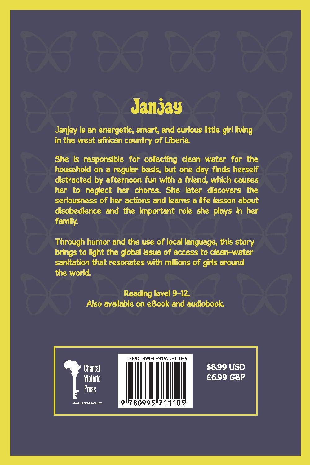 Janjay is an energetic, smart, and curious little girl living in the West African country of Liberia.She is responsible for collecting clean water for the household on a regular basis, but one day finds herself distracted by afternoon fun with a friend, which causes her to neglect her chores. She later discovers the seriousness of her actions and learns a real life lesson about disobedience and the important role she plays in her family.Through humor and the use of local language, this story brings to light the global issue of access to clean-water sanitation that resonates with millions of girls around the world.