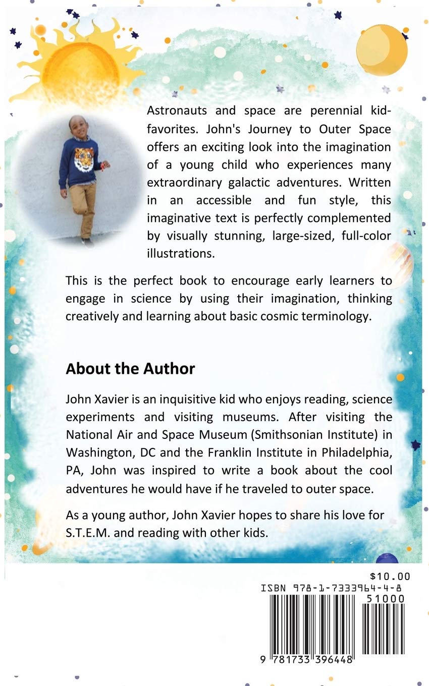 Astronauts and space are perennial kid-favorites. John’s Journey to Outer Space offers an exciting look into the imagination of a young, African-American boy who experiences many extraordinary galactic adventures in outer space. Written in an accessible and fun style, this informative text is perfectly complemented by visually stunning, large-sized, full-color illustrations. This is the perfect book to encourage children aged three and over to engage in S.T.E.M by using their imagination, thinking creatively and learning about basic cosmic terminology. Supports Learning: Promotes problem-solving Encourages focus Supports early learning of outer space terminology Inspires creativity and imagination with lively illustrations Empowers children with a ‘Can Do’ mindset