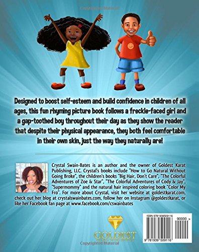 Designed to boost self-esteem and build confidence in children of all ages, this fun rhyming picture book follows a freckle-faced girl and a gap-toothed boy throughout their day as they show the reader they celebrate their appearance and feel comfortable in their own skin, just the way they naturally are!
