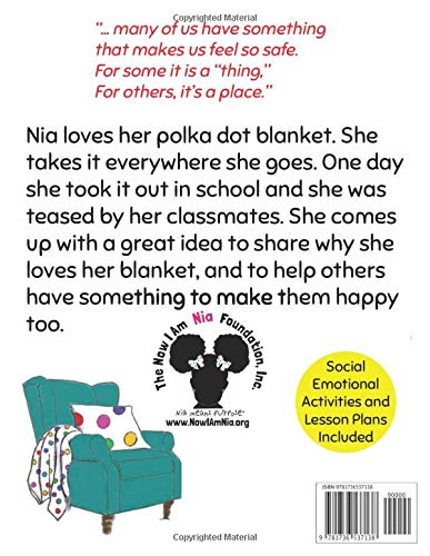 Nia loves her polka dot blanket. She takes it everywhere she goes. One day she took it out in school and she was teased by her classmates. She comes up with a great idea on how she can help others understand why she loves her blanket.
