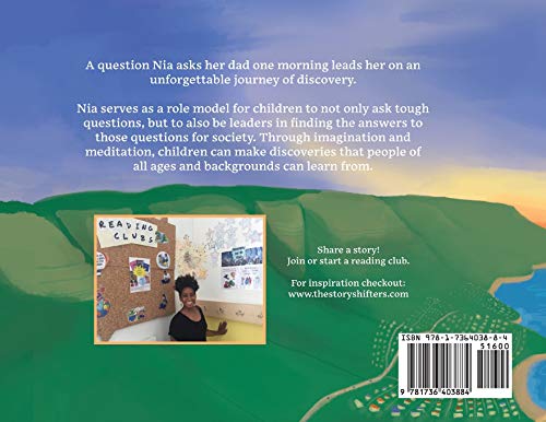 A question Nia asks her dad one morning leads her on an unforgettable journey of discovery. Nia serves as a role model for children to not only ask tough questions, but to also be leaders in finding the answers to those questions for society. Through imagination and meditation, children can make discoveries that people of all ages and backgrounds can learn from.
