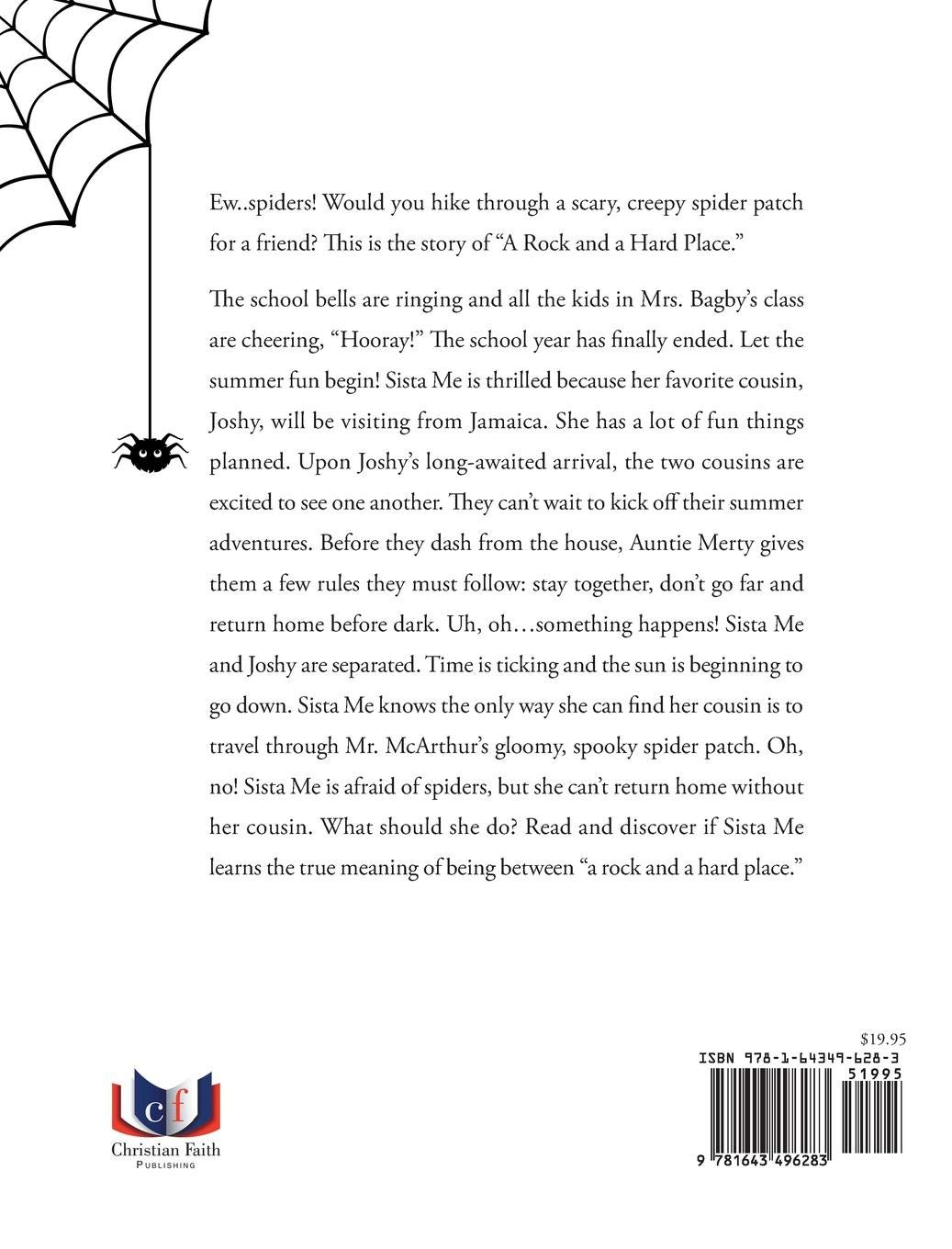 The school bells are ringing and all the kids in Mrs. Bagby’s class are cheering, “Hooray!” The school year has finally ended. Let the summer fun begin! Sista Me is thrilled because her favorite cousin, Joshy, will be visiting from Jamaica. She has a lot of fun things planned. Upon Joshy’s long-awaited arrival, the two cousins are excited to see one another. They can’t wait to kick off their summer adventures. Before they dash from the house, Auntie Merty gives them a few rules they must follow: stay together, don’t go far and return home before dark. Uh, oh…something happens! Sista Me and Joshy are separated. Time is ticking and the sun is beginning to go down. Sista Me knows the only way she can find her cousin is to travel through Mr. McArthur’s gloomy, spooky spider patch. Oh, no! Sista Me is afraid of spiders, but she can’t return home without her cousin. What should she do? Read and discover if Sista Me learns the true meaning of being between “a rock and a hard place.”