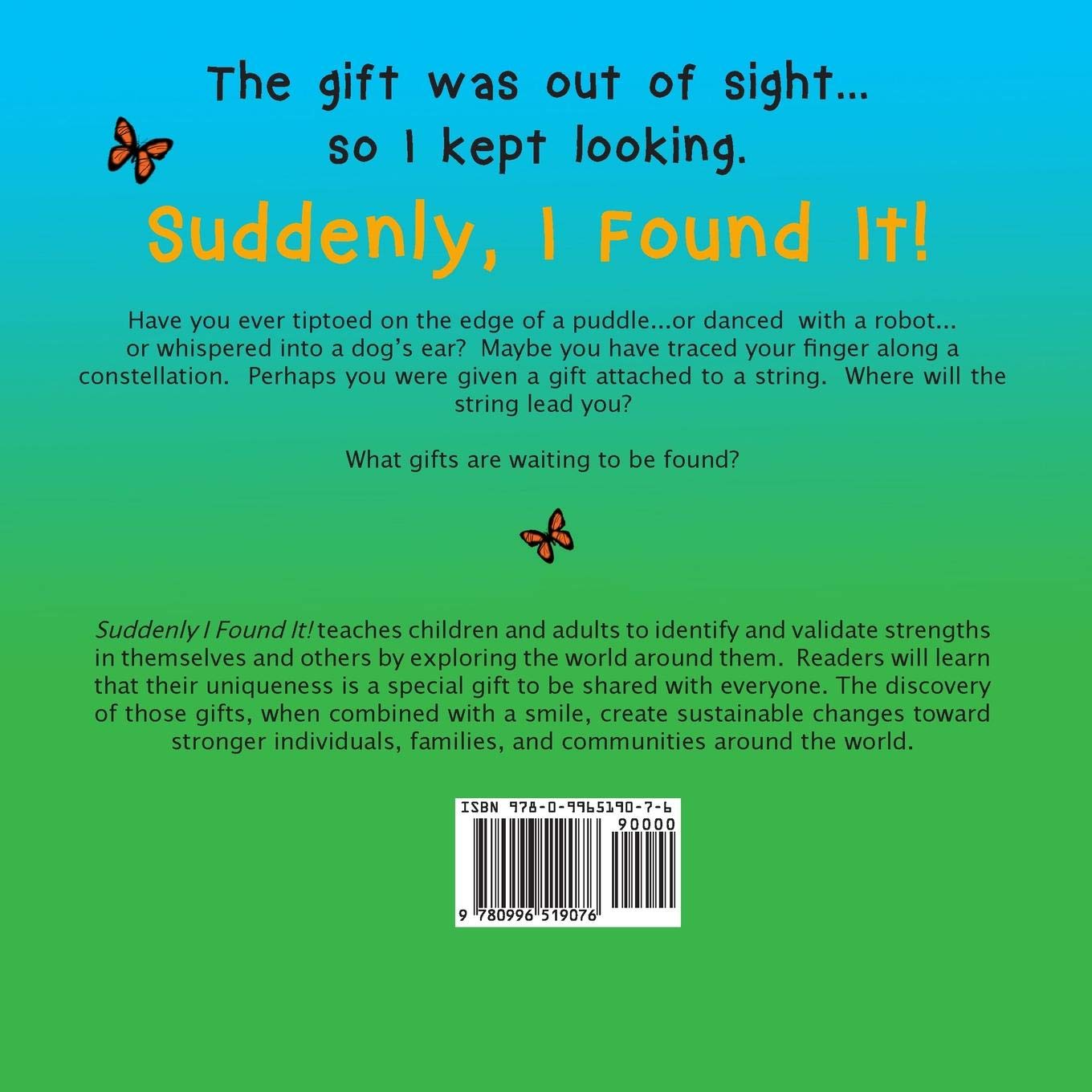 With bold, vibrant illustrations that take the reader on a fantastic journey following a string, Suddenly I Found It! addresses the joy of discovery and a little boy’s appreciation for the gifts found within. The poetic cadence and repetitive phrases help children remember that if the gift is out of sight, you must always “keep looking.” You may have to move things around and also face your fears, yet an opportunity to find a gift awaits the seeker on every adventure. The discovery of those gifts, when combined with a smile, creates sustainable changes toward stronger individuals, families, and communities around the world.
