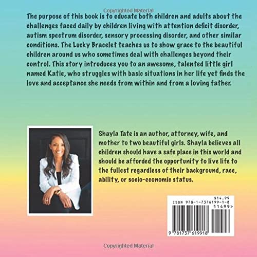 The purpose of this book is to educate both children and adults about the challenges faced daily by children with Attention Deficit Hyperactivity Disorder (ADHD), Autism Spectrum Disorder (ASD), Sensory Processing Disorder (SPD), and other similar conditions. The Lucky Bracelet teaches us to show grace to the beautiful children around us who sometimes deal with challenges beyond their control. The Lucky Bracelet introduces you toan amazing, talented little girl named Katie, who struggles with basic situations in her life yet finds the love and acceptance she needs from within and from a loving father.