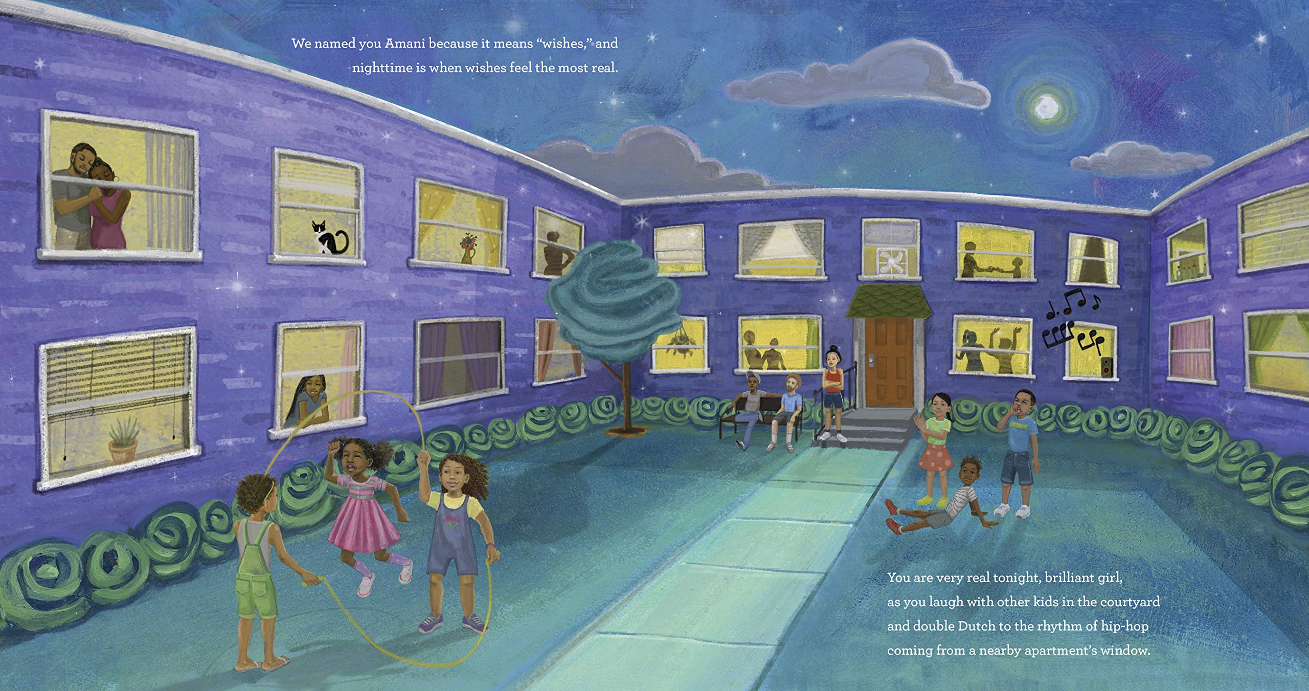 This lyrical text, narrated to a young girl named Amani by her father, follows her as she plays an evening game of hide-and-seek with friends at her apartment complex. The moon’s glow helps Amani find the last hidden child, and seems almost like a partner to her in her game, as well as a spotlight pointing out her beauty and strength.