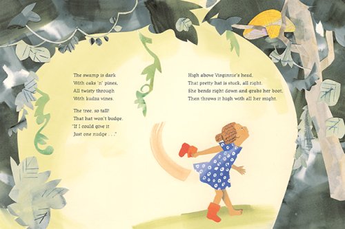 Virginnie is a freckly gal who wears a wide straw hat to shade her from the southern sun. When a puff of wind sends that hat adrift in the swamp — right to the top of a sycamore tree — she braves some scary creatures to get it back! Crawdaddy craw, snickery snake, swaying gator. . . . What will she tell her mama at the end of the day? Lilting language and expressive collages paint a lush, lively picture of a determined young girl and her dauntless adventure.
