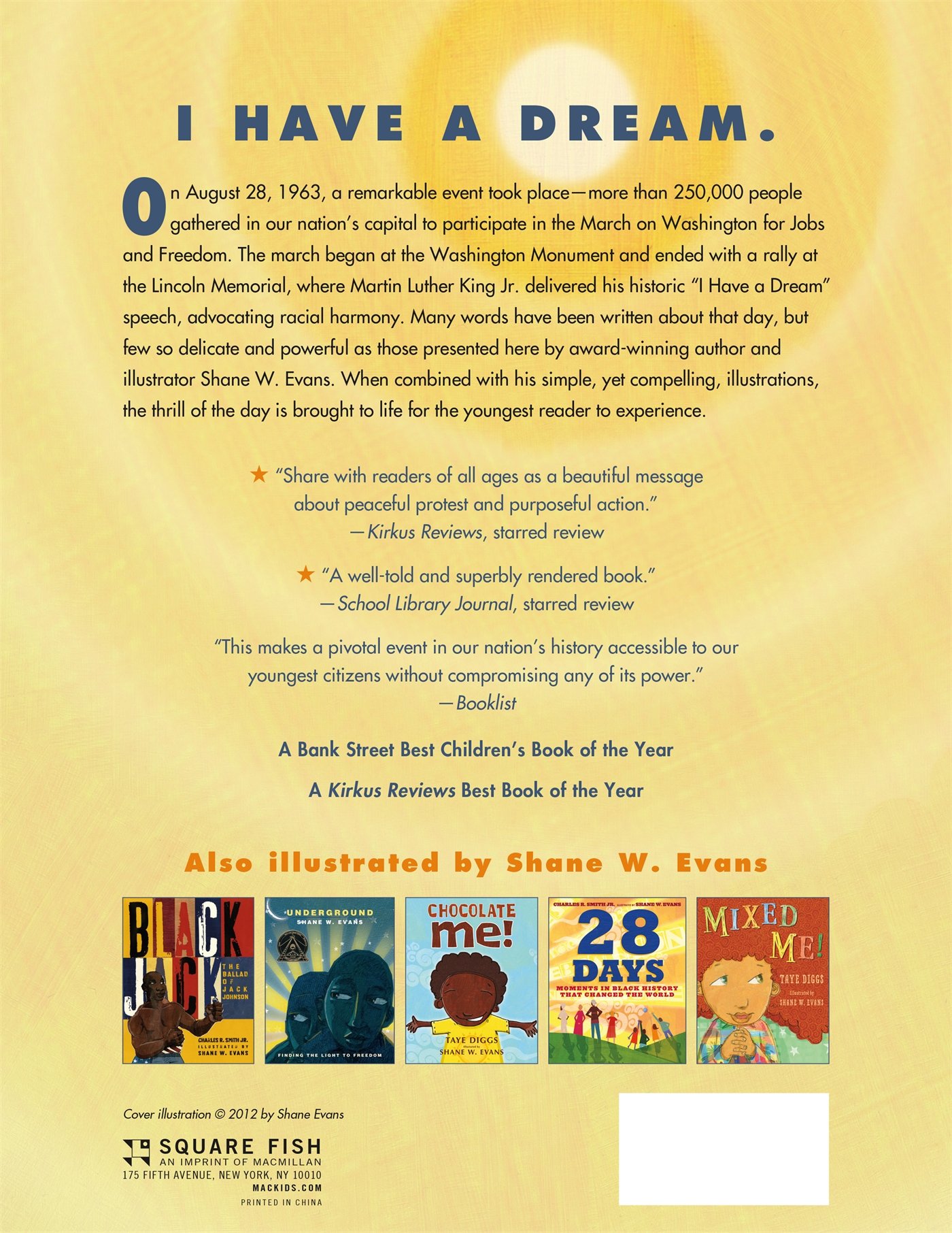 On August 28, 1963, a remarkable event took place–more than 250,000 people gathered in our nation’s capital to participate in the March on Washington for Jobs and Freedom. The march began at the Washington Monument and ended with a rally at the Lincoln Memorial, where Martin Luther King Jr. delivered his historic “I Have a Dream” speech, advocating racial harmony. Many words have been written about that day, but few so delicate and powerful as those presented here by award-winning author and illustrator Shane W. Evans. When combined with his simple yet compelling illustrations, the thrill of the day is brought to life for even the youngest reader to experience.