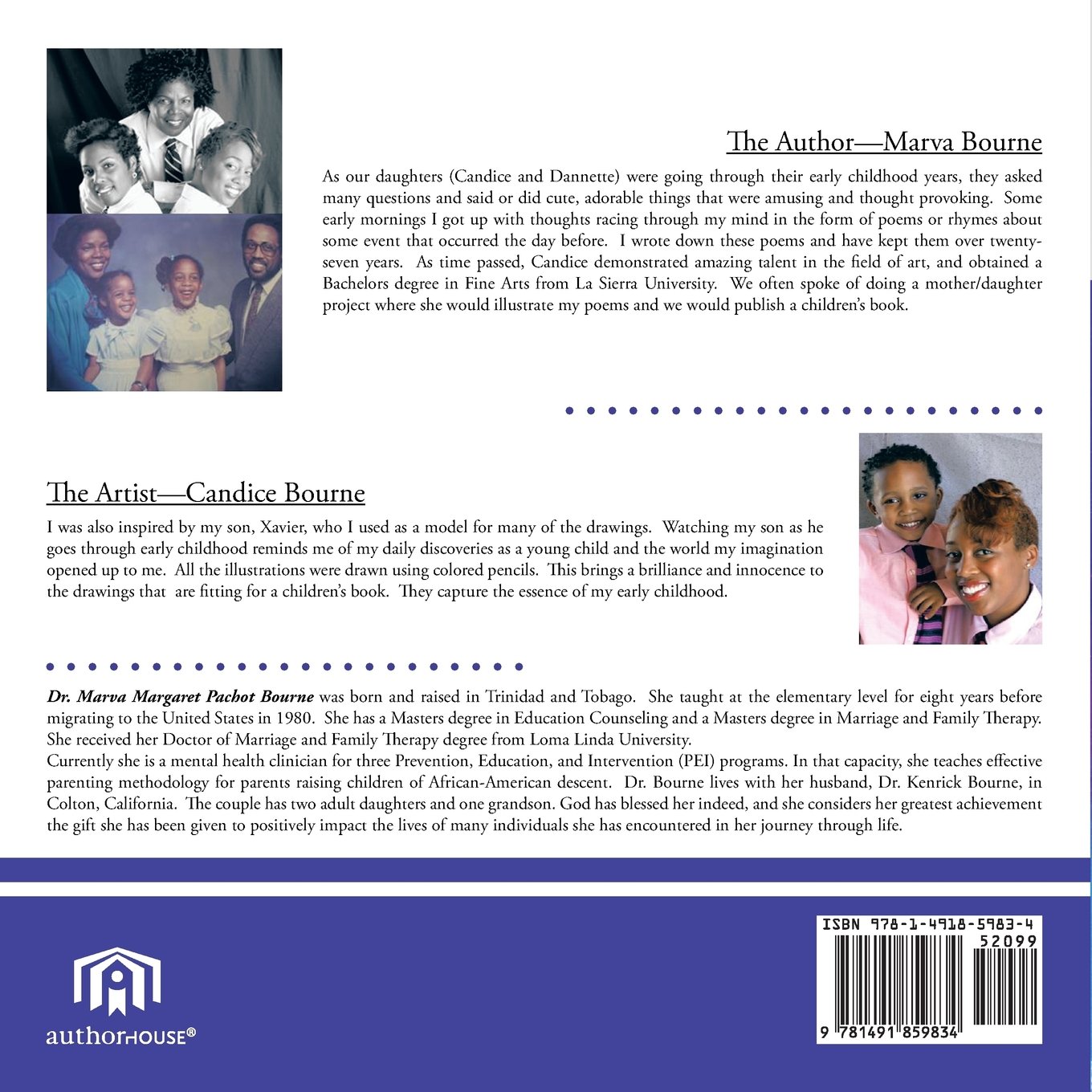 As our daughters (Candice and Dannette) were going through their early childhood years, they asked many questions and said or did cute, adorable things that were amusing and thought provoking. Some early mornings I got up with thoughts racing through my mind in the form of poems or rhymes about some event that occurred the day before. I wrote down these poems and have kept them over twenty-seven years. As time passed, Candice demonstrated amazing talent in the field of drawing, and obtained a Bachelors degree in Fine Arts from La Sierra University. We often spoke of doing a mother/daughter project where she would illustrate my poems and we would publish a children’s book.