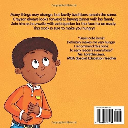 Many things may change, but family traditions remain the same. Grayson always looks forward to having dinner with his family. Join him as he awaits with anticipation for the food to be ready. This book is sure to make you hungry!