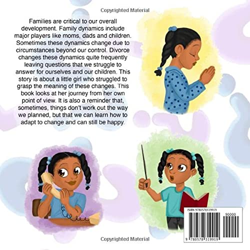 Families are critical to our overall development. Family dynamics include major players like moms, dads and children. Sometimes these dynamics change due to circumstances beyond our control. Divorce changes these dynamics quite frequently leaving questions that we struggle to answer for ourselves and our children. This story is about a little girl who struggled to grasp the meaning of these changes. This book looks at her journey from her own point of view. It is also a reminder that, sometimes, things don’t work out the way we planned, but that we can learn how to adapt to change and can still be happy.